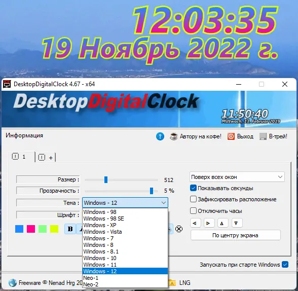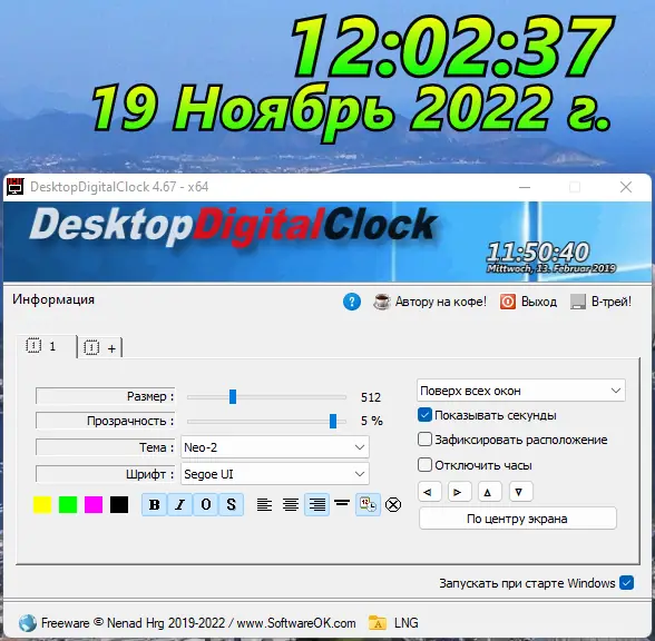 DesktopDigitalClock представляет собой компактное решение для тех, кто хочет видеть актуальное время в удобном формате прямо на экране. Приложение отображает текущие часы и минуты с возможностью включения секундной стрелки, что добавляет функциональности. Интерфейс остаётся ненавязчивым, но информативным, не перегружая рабочее пространство.