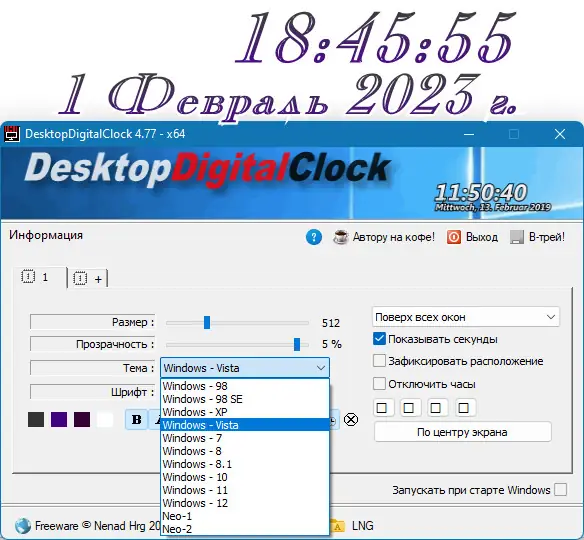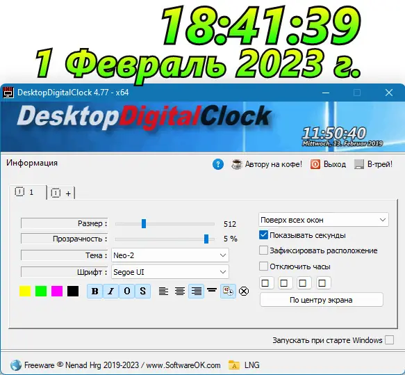 DesktopDigitalClock — это легковесное приложение для отображения цифровых часов на рабочем столе с широкими возможностями настройки внешнего вида и поведения. Программа поддерживает смену тем, шрифтов, прозрачность интерфейса и фиксацию позиции, не нагружая систему. Идеально подходит для пользователей, ценящих персонализацию и минимализм.