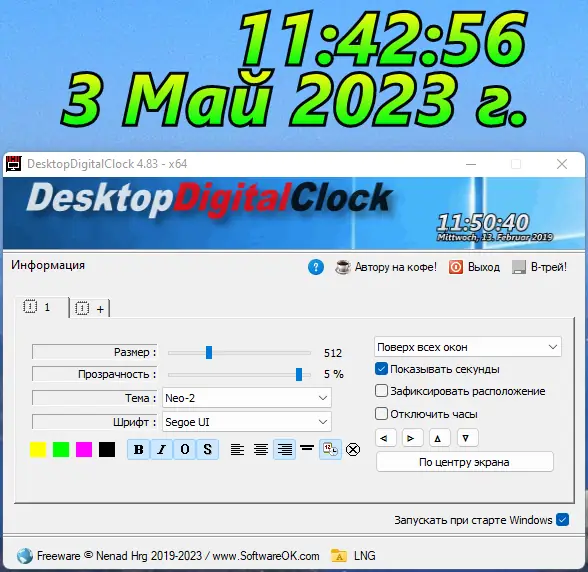 - Регулировка прозрачности окна часов в зависимости от фона рабочего стола