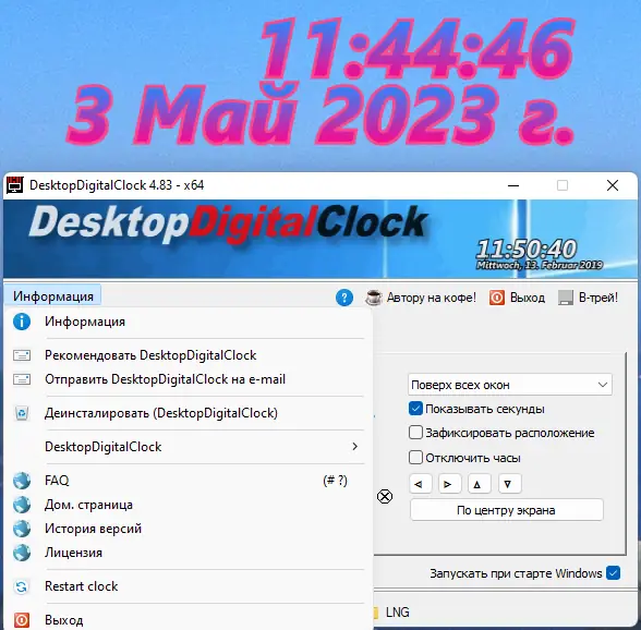 DesktopDigitalClock доступен для бесплатного скачивания в портативной версии, совместимой с современными версиями Windows. Установка языка выполняется через встроенный выбор в меню LNG, где доступен русский и другие языки. Конфигурационный файл автоматически создаётся в системной папке, но может быть перенесён в рабочую директорию для полноценного портативного использования. Программа поддерживает тёмные и светлые темы, работает в фоновом режиме и не мешает повседневным задачам.