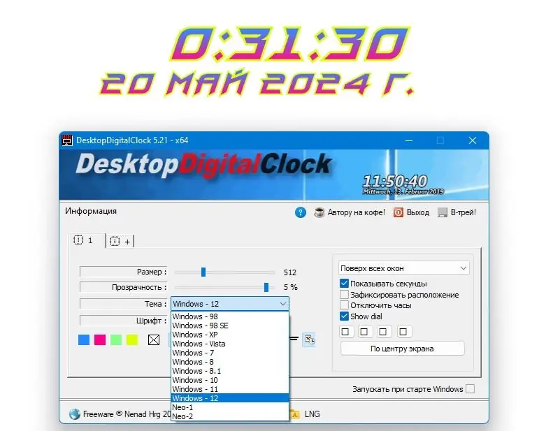 DesktopDigitalClock — это легковесное приложение для отображения стильных цифровых часов прямо на рабочем столе. Программа предлагает широкие возможности по настройке внешнего вида: выбор темы, шрифта, прозрачности, размера и положения индикатора времени. Благодаря минимальному потреблению ресурсов и отсутствию необходимости в установке, приложение идеально подходит для повседневного использования.