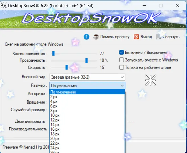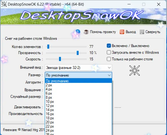- Настройка интенсивности снегопада — от 5 до 64 снежинок одновременно