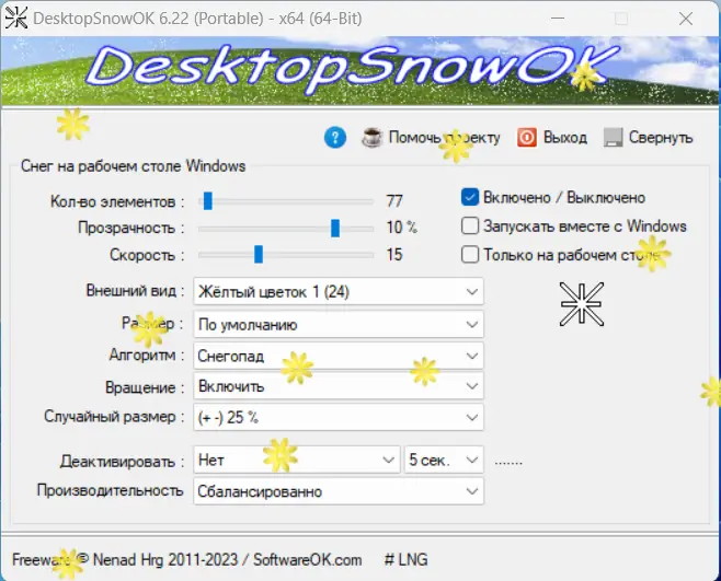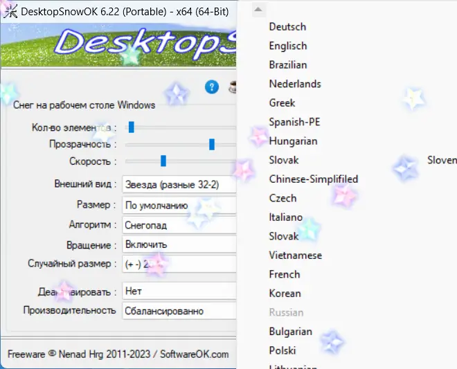 Запуск программы осуществляется сразу после извлечения из архива — установка не требуется. После старта появляется небольшое окно настроек, где можно выбрать форму снежинок, их количество, степень прозрачности и скорость перемещения по экрану. Для смены языка интерфейса следует перейти в меню # LNG и выбрать «Русский».