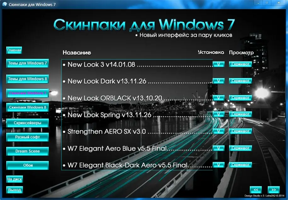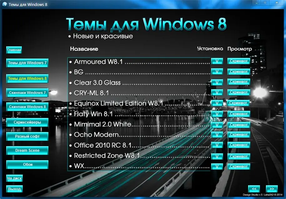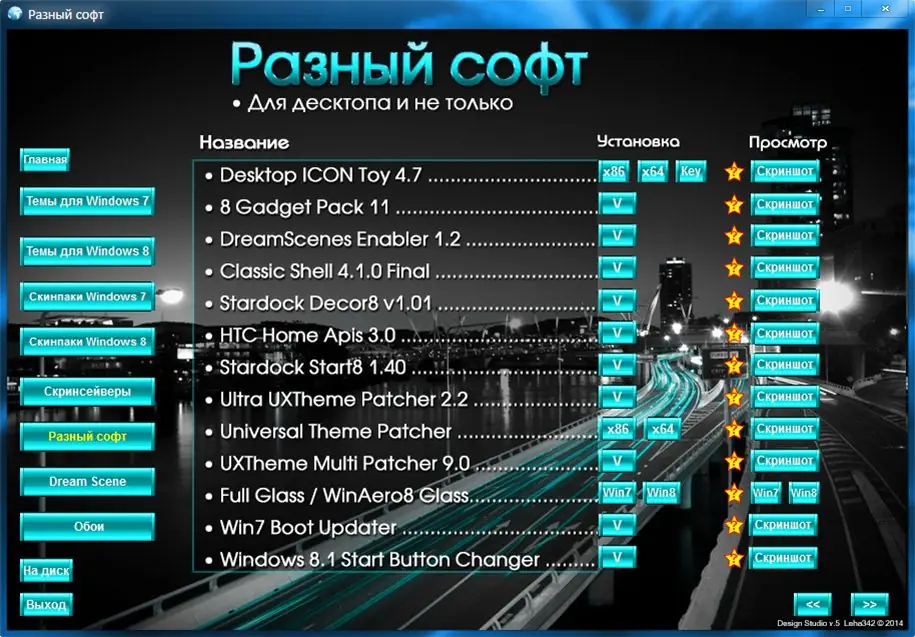 Дизайн Студия v.5.2014 — универсальный сборник для персонализации интерфейса Windows 7, 8 и 8.1. Включает темы оформления, живые обои, скинпаки, скринсейверы, утилиты для настройки системы и качественные обои из личной коллекции. Все компоненты организованы по категориям с интуитивной оболочкой, описаниями и скриншотами.