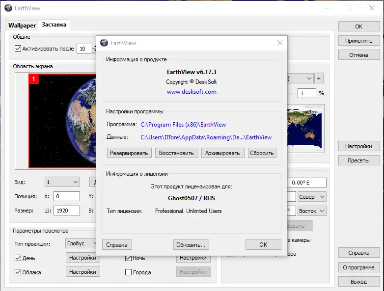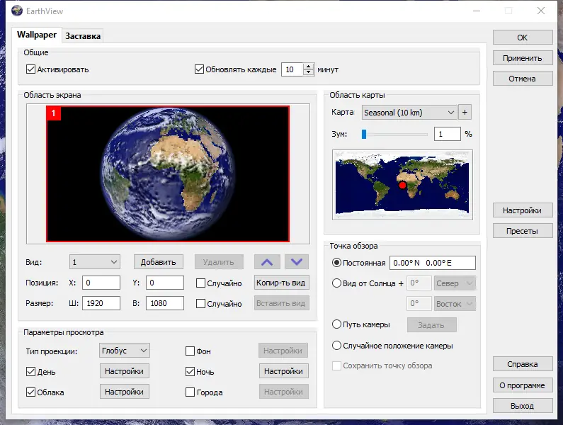EarthView — это программное обеспечение для создания динамических обоев и экранных заставок, отображающих реалистичные виды Земли с плавными переходами между дневным и ночным освещением. Приложение генерирует высококачественные изображения в разрешениях, превышающих 3840×2160, с поддержкой детализированных карт, атмосферных эффектов, облаков и данных о погоде. Программа подходит как для персонального использования, так и для корпоративных целей, обеспечивая гибкую настройку отображения глобуса и карты.