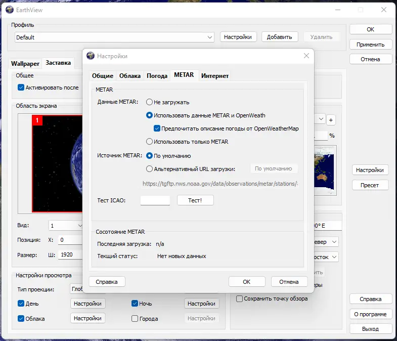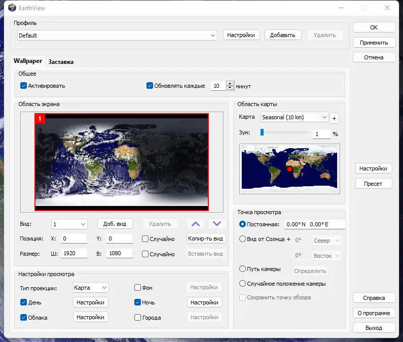 EarthView — динамические обои для рабочего стола и экранные заставки, отображающие Землю с реалистичной сменой дня и ночи, атмосферными эффектами, облачностью и городскими огнями. Программа генерирует высококачественные изображения с поддержкой разрешений до 4K и выше, включая детализированные карты с сезонными изменениями. Возможна настройка отображения погоды, времени и локаций более чем 140 тысяч городов.