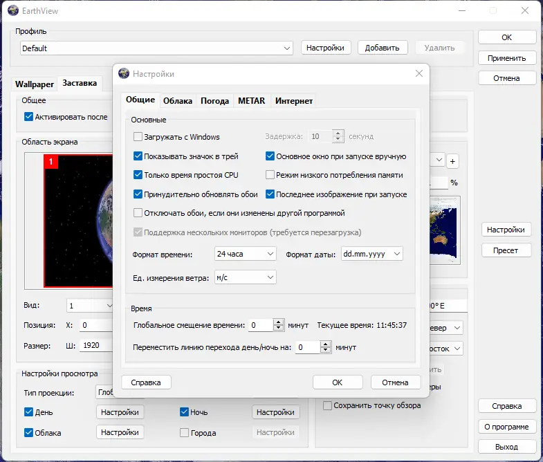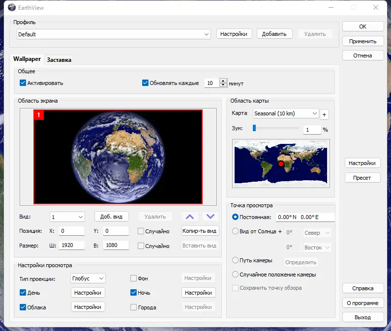 EarthView — программа для создания динамических обоев и экранной заставки, отображающей Землю с реалистичными эффектами дня, ночи, облаков, городских огней и атмосферных явлений. Изображения генерируются с высокой детализацией, поддерживают разрешения до 4K и выше. Программа визуализирует планету в реальном времени с учётом текущего времени, погоды и сезонных изменений.