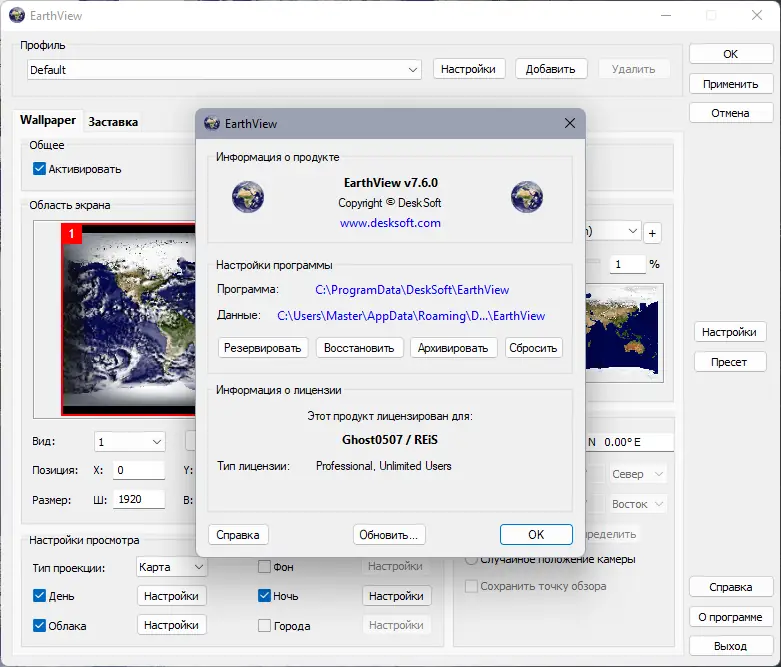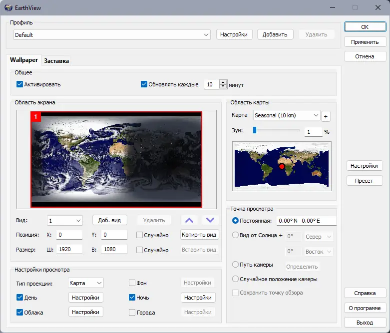 EarthView — динамические 3D обои и экранный хранитель, отображающие Землю в реальном времени с точной сменой дня и ночи, атмосферными эффектами, облачностью и городскими огнями. Программа генерирует высококачественные изображения с поддержкой разрешений до 4K и выше, включая мультимониторные конфигурации. Визуализация основана на реальных геоданных, включая сезонные изменения растительности, снежного покрова и ледников.