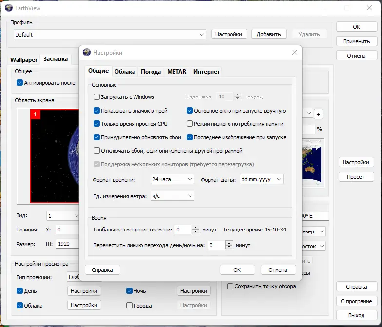 После установки EarthView автоматически запускается как обои или хранитель экрана, в зависимости от выбранного режима. Основные настройки доступны через контекстное меню на рабочем столе, где можно выбрать тип карты, включить отображение облаков, настроить уровень масштабирования и включить показ погодных данных. Пользователь может переключаться между разными проекциями, устанавливать интервал обновления изображений и задавать параметры отображения городов и их освещения. Для продвинутых пользователей доступна возможность загрузки дополнительных карт высокого разрешения и импорт пользовательских конфигураций из .dcf-файлов.