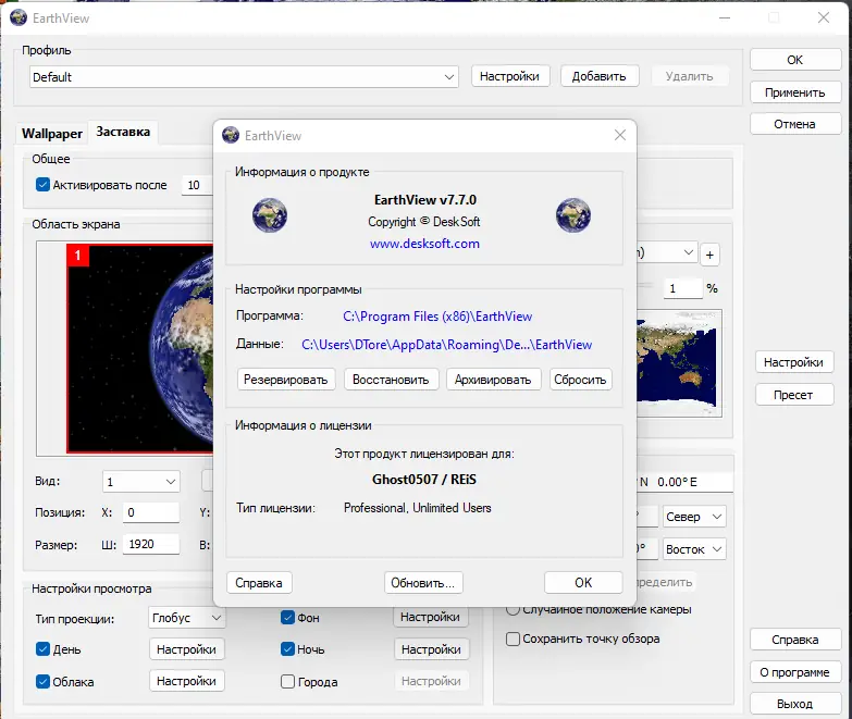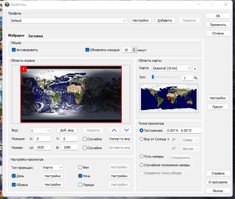 EarthView — программа для создания динамических обоев и экранной заставки, отображающих вращающуюся Землю с реалистичными дневными и ночными зонами, атмосферными эффектами, городскими огнями и облачностью. Приложение генерирует высококачественные изображения в разрешении до 4K и выше, поддерживая детализированные карты с сезонными изменениями. Программа подходит как для домашнего использования, так и в офисной среде благодаря гибкой настройке и поддержке нескольких мониторов.