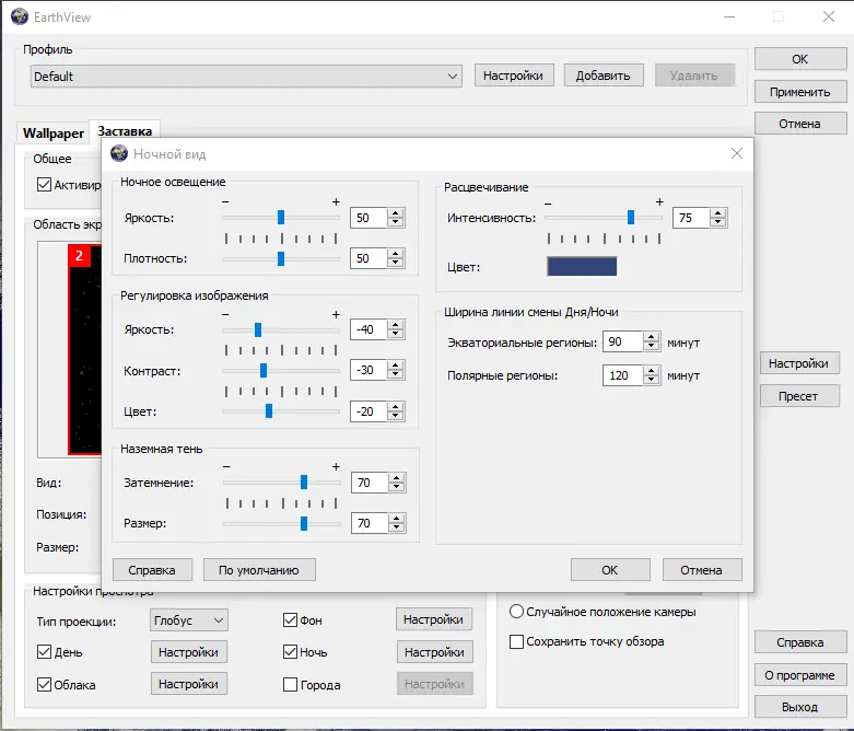 После установки программа запускается через главное окно, где доступны все настройки отображения. Пользователь выбирает тип вида — глобус, карта или комбинированный режим — и задаёт параметры анимации: скорость вращения, угол наклона, текущее время. Можно включить отображение облаков, погоды и городских огней, а также настроить фоновые изображения, например, для корпоративного брендинга. Для многомониторных систем устанавливается индивидуальный вид для каждого экрана. Настройки сохраняются в .dcf-файлы, что позволяет легко переносить конфигурации между устройствами.