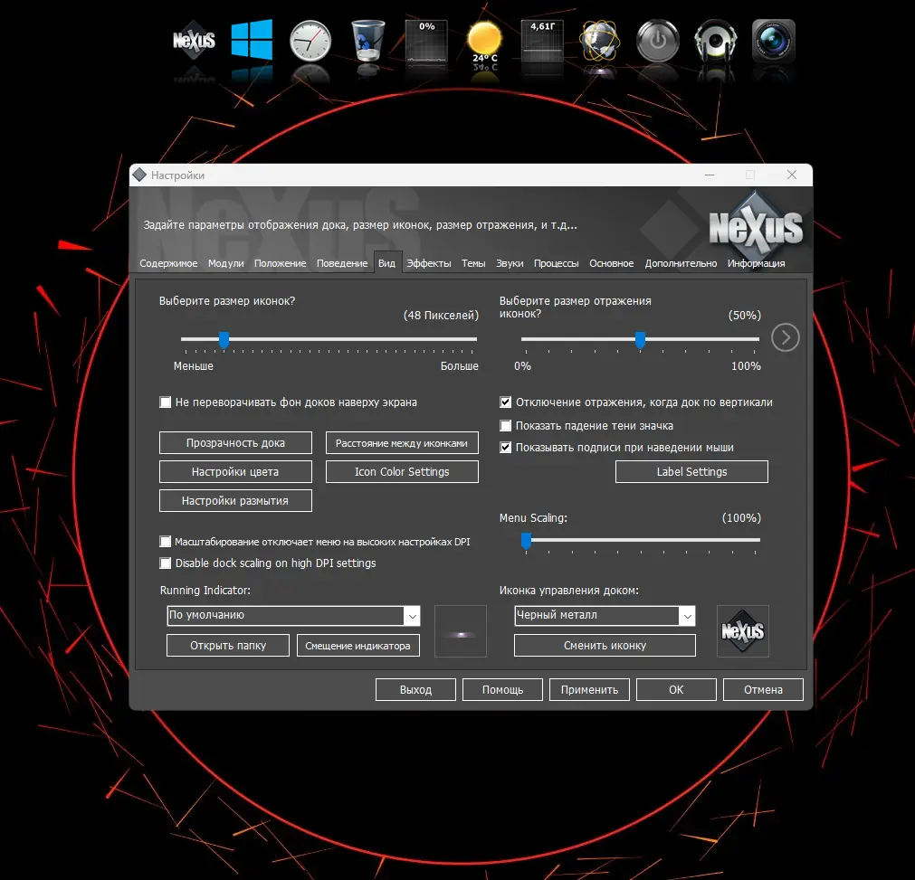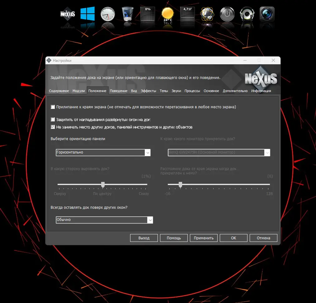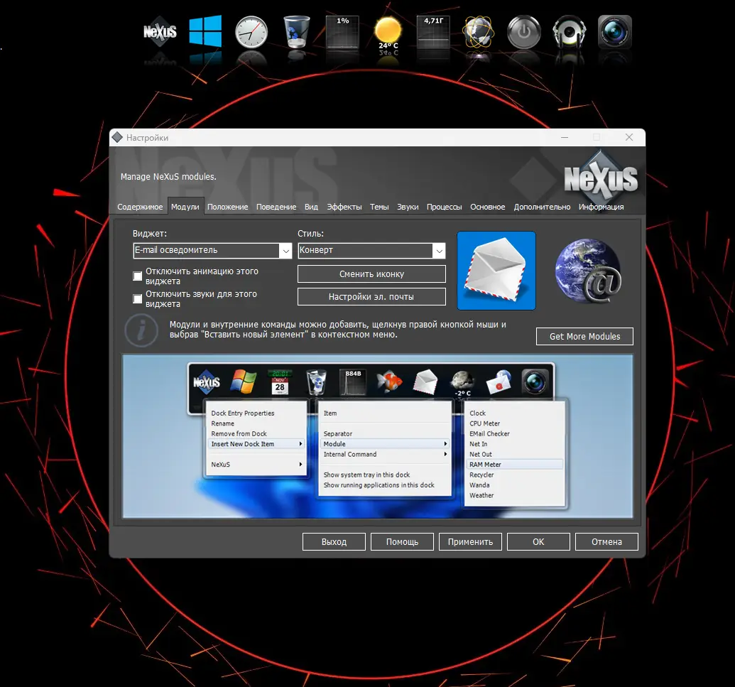 Использование Winstep Nexus начинается с установки и запуска приложения, после чего панель автоматически появляется на экране. Пользователь может перетаскивать ярлыки программ, файлов или папок прямо на док, где они будут отображаться в виде иконок с поддержкой анимации. Через контекстное меню доступны параметры изменения внешнего вида, поведения при наведении, прозрачности фона и привязки к краям экрана. Дополнительно можно добавлять модули, такие как календарь, погода или менеджер задач, расширяя функциональность рабочего стола.