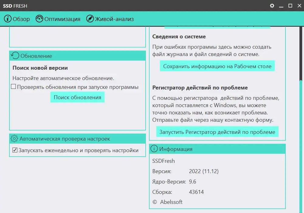Abelssoft SSD Fresh — утилита для оптимизации твердотельных накопителей в системах Windows, позволяющая продлить срок службы SSD, повысить производительность и снизить нагрузку на диск за счёт отключения избыточных фоновых процессов. Программа автоматизирует настройку операционной системы под работу с SSD, включая отключение дефрагментации, индексации и других функций, вызывающих постоянные операции записи. Инструмент поддерживает анализ состояния диска, отображение данных SMART и настройку параметров системы для максимальной эффективности.