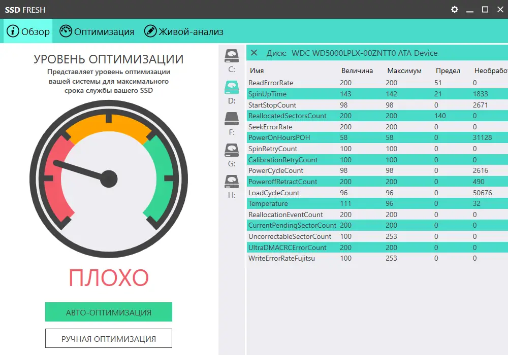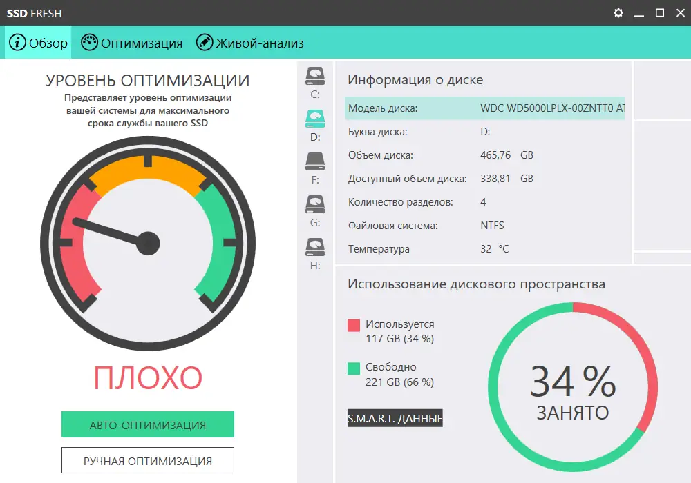 - Анализ состояния SSD с отображением данных S.M.A.R.T. для оценки износа и прогнозирования возможных сбоев