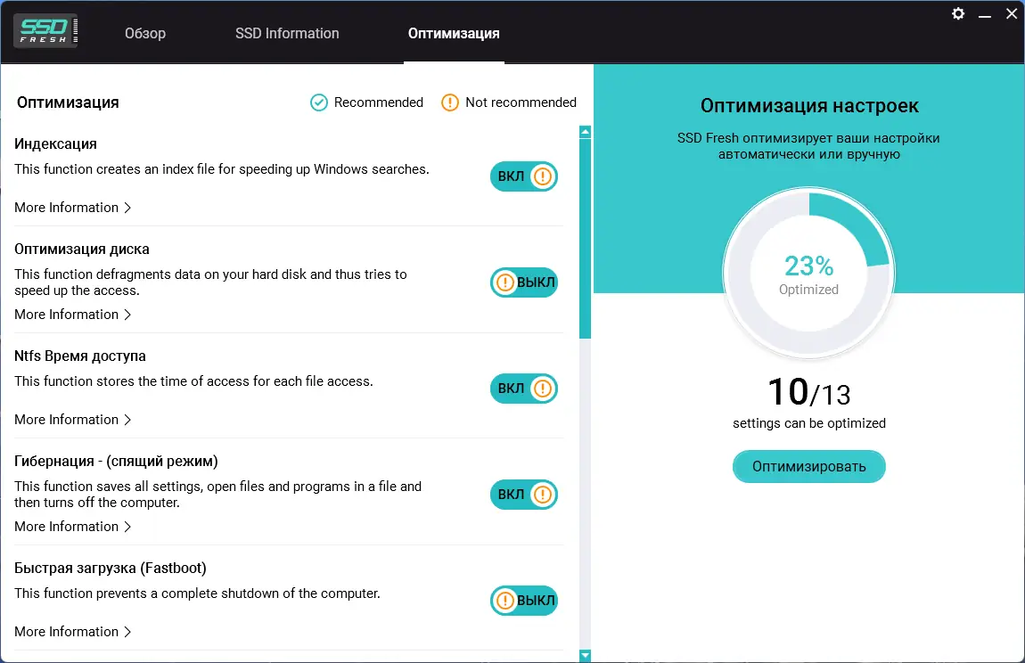 Abelssoft SSD Fresh разработана с учетом специфики работы твердотельных накопителей, которые, в отличие от традиционных жестких дисков, имеют ограниченное количество циклов записи. Программное обеспечение анализирует текущее состояние диска, отображает ключевые параметры через данные S.M.A.R.T. и рекомендует оптимальные настройки. Утилита помогает минимизировать износ SSD за счет отключения фоновых процессов, несовместимых с архитектурой флеш-памяти.