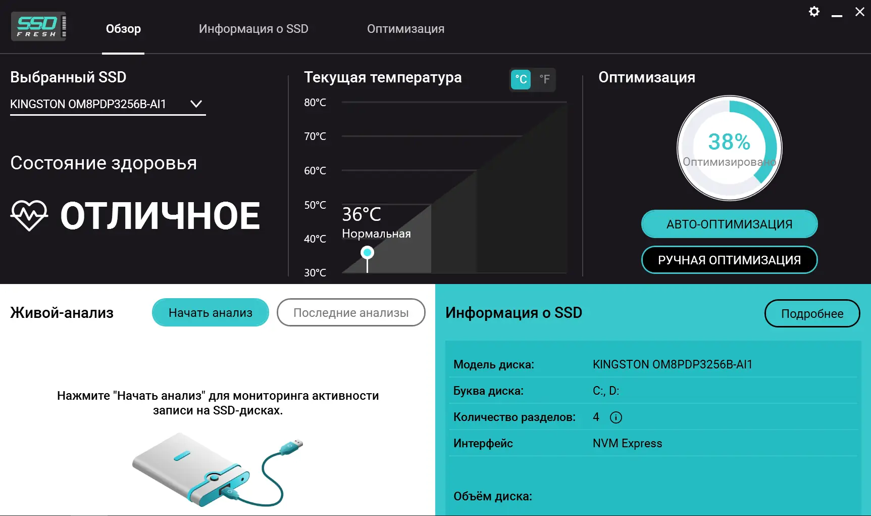 - Позволяет просматривать свойства подключённого SSD, включая объём, модель и текущий статус подключения.