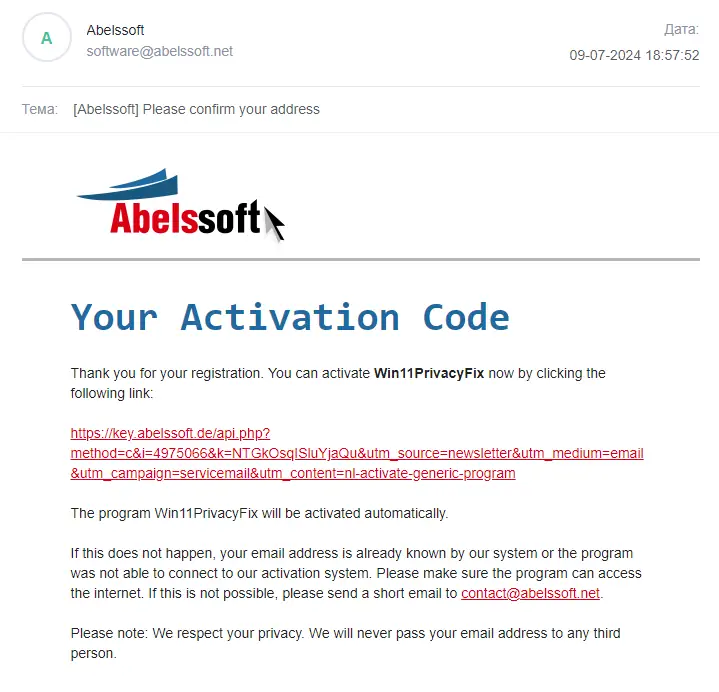 Abelssoft Win11PrivacyFix доступна для бесплатного скачивания в рамках специального предложения. Утилита подходит для домашнего использования и работает на актуальных версиях Windows. Регистрация проходит через электронную почту, после чего программа активируется автоматически. После установки можно сразу приступать к настройке параметров конфиденциальности.