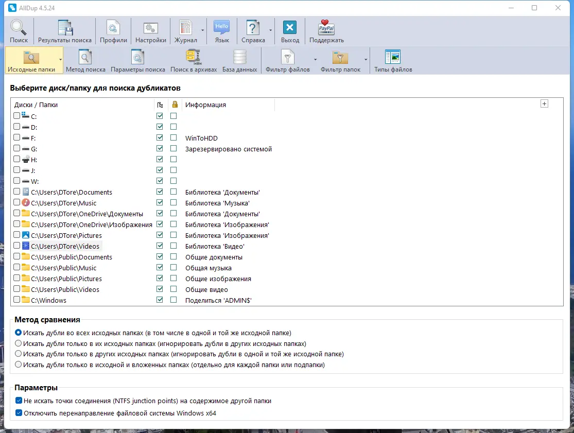 - Поддержка поиска дубликатов на нескольких дисках и в заданных папках одновременно.