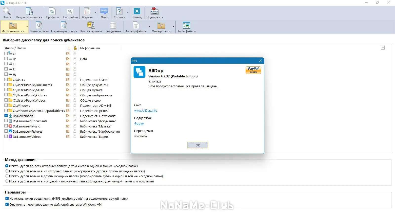 AllDup — это бесплатное приложение, предназначенное для эффективного поиска дубликатов файлов на жёстких дисках. Программа анализирует данные по множеству параметров, включая имя, размер, содержимое и дату изменения, обеспечивая точное обнаружение повторяющихся файлов. С её помощью можно освободить значительное дисковое пространство, удалив ненужные копии документов, изображений, аудио и видео.