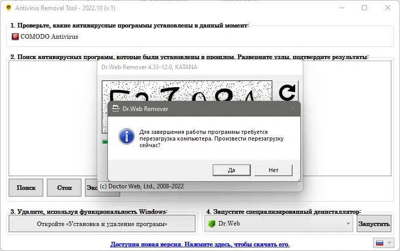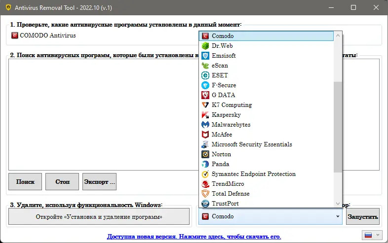 - Автоматическое определение установленного антивируса и предложение соответствующей утилиты для удаления.