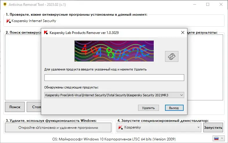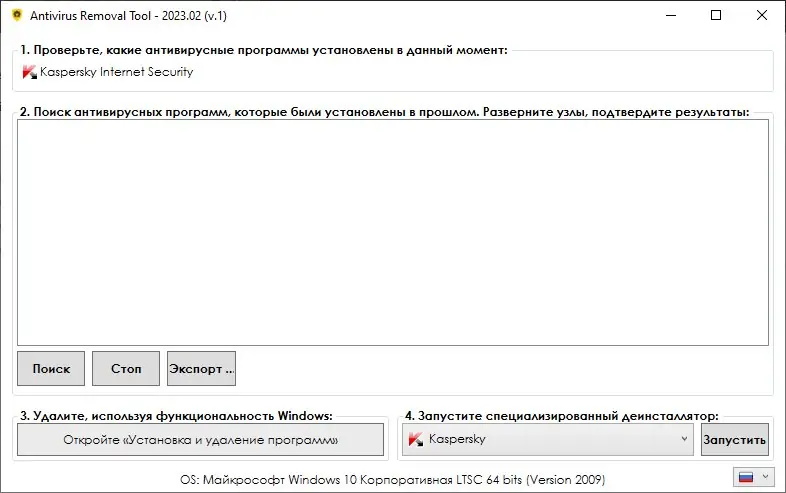 - Автоматическое распознавание установленного антивирусного ПО для быстрого запуска нужного деинсталлятора