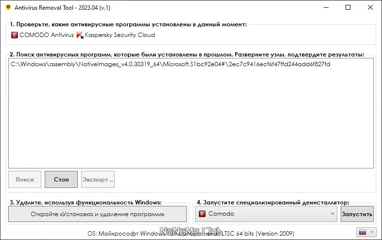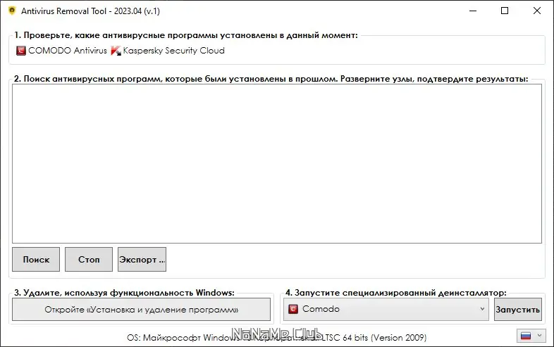 Запуск Antivirus Removal Tool не требует установки — достаточно запустить исполняемый файл. После старта программа автоматически сканирует систему на наличие установленных антивирусных продуктов. Пользователь может вручную выбрать нужный деинсталлятор из списка или позволить программе предложить подходящий инструмент на основе обнаруженного ПО. Также доступна функция поиска следов ранее удалённых антивирусов, что позволяет провести дополнительную очистку реестра и файловой системы.