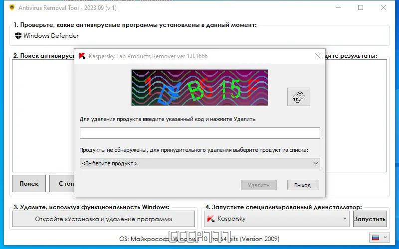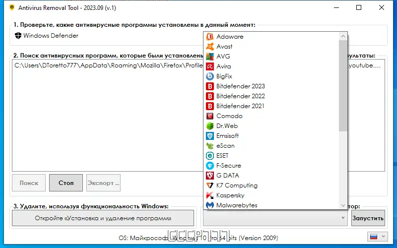 - Программа автоматически сканирует систему на наличие установленного антивирусного ПО и предлагает соответствующий деинсталлятор.