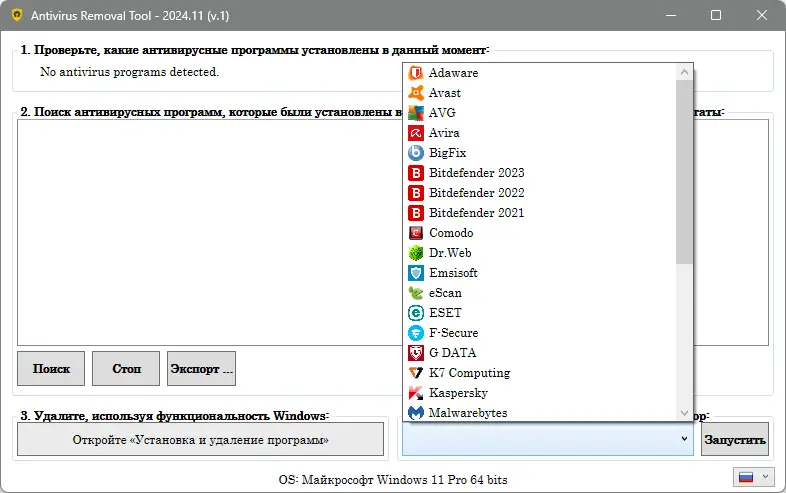 Запуск программы не требует инсталляции — достаточно открыть исполняемый файл. После старта интерфейс автоматически проверяет систему на наличие установленных антивирусных продуктов и предлагает соответствующие утилиты удаления. Пользователь может вручную выбрать нужный деинсталлятор из списка или запустить сканирование на остатки уже удалённых программ для дополнительной очистки. Процесс сопровождается понятными подсказками, а перезагрузка выполняется при необходимости для завершения удаления.