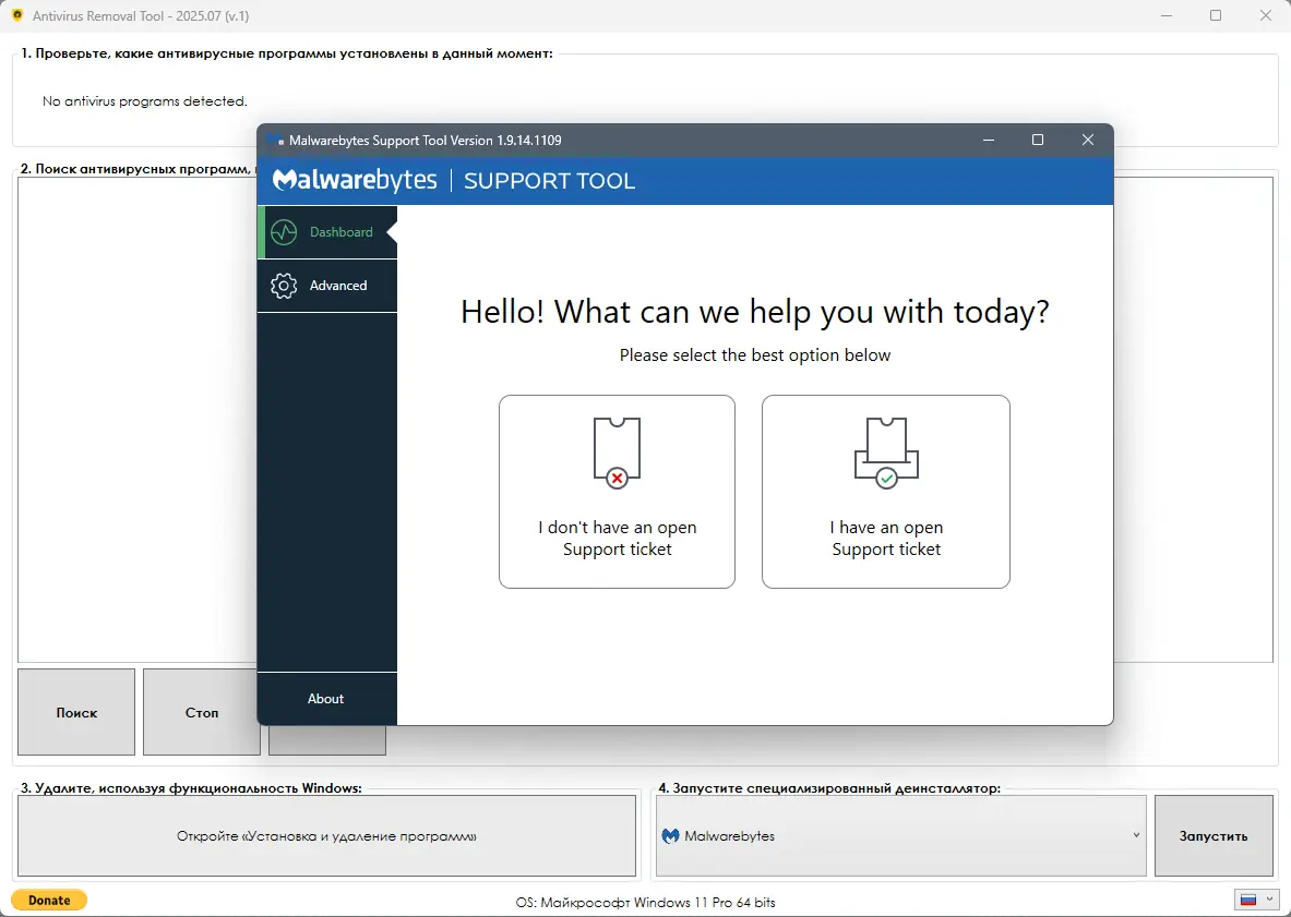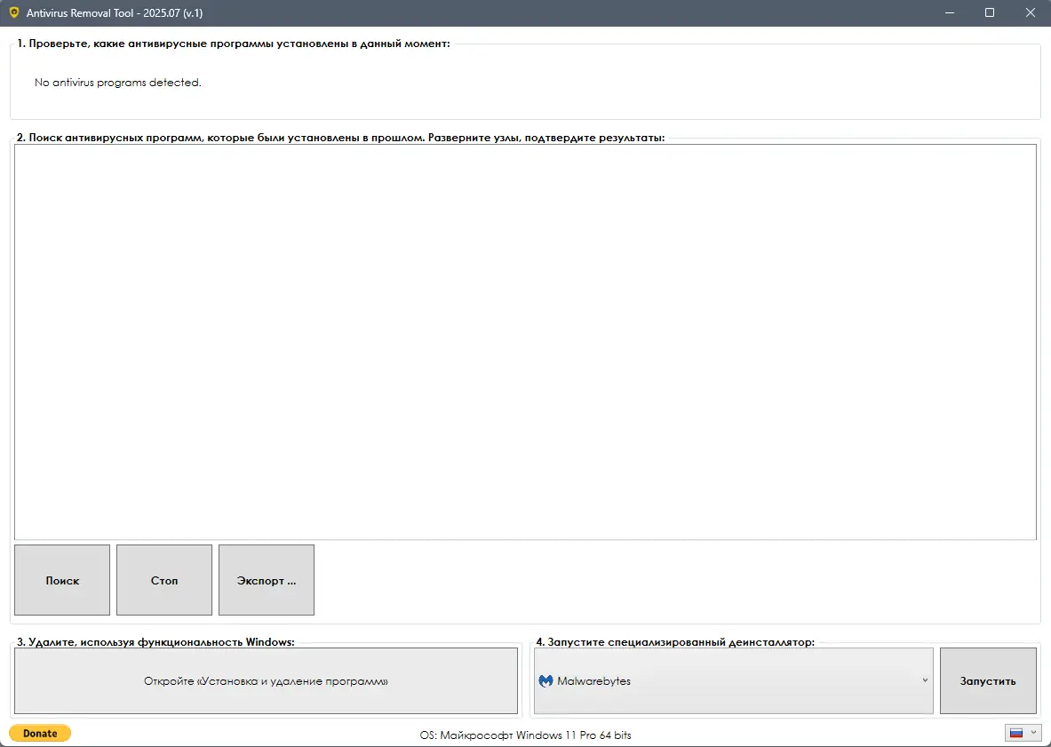 Запуск программы не требует установки — достаточно открыть исполняемый файл. После старта Antivirus Removal Tool автоматически анализирует систему, определяя, какой антивирус установлен в данный момент. Пользователь может вручную выбрать утилиту из списка или позволить программе предложить подходящий инструмент на основе обнаруженного ПО. Для дополнительной очистки доступна функция сканирования на наличие остатков ранее удалённых решений, после чего можно запустить соответствующий деинсталлятор. По завершении процесса рекомендуется перезагрузить компьютер для полного завершения операций в системе.