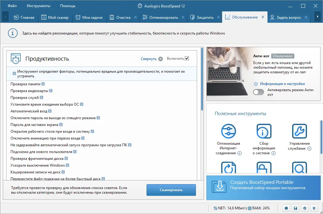 Auslogics BoostSpeed сочетает в себе широкий функционал и интуитивное управление, что делает его одним из лидеров среди твикеров. Программа регулярно обновляется, поддерживает последние версии Windows и предлагает как базовые, так и продвинутые инструменты. При этом она не перегружает систему, работая эффективно даже на слабых конфигурациях. Некоторые функции требуют внимательного подхода, особенно при редактировании реестра или управления службами.