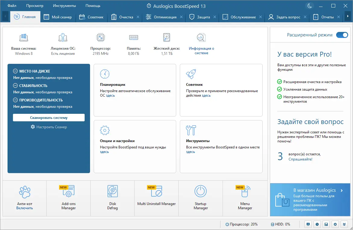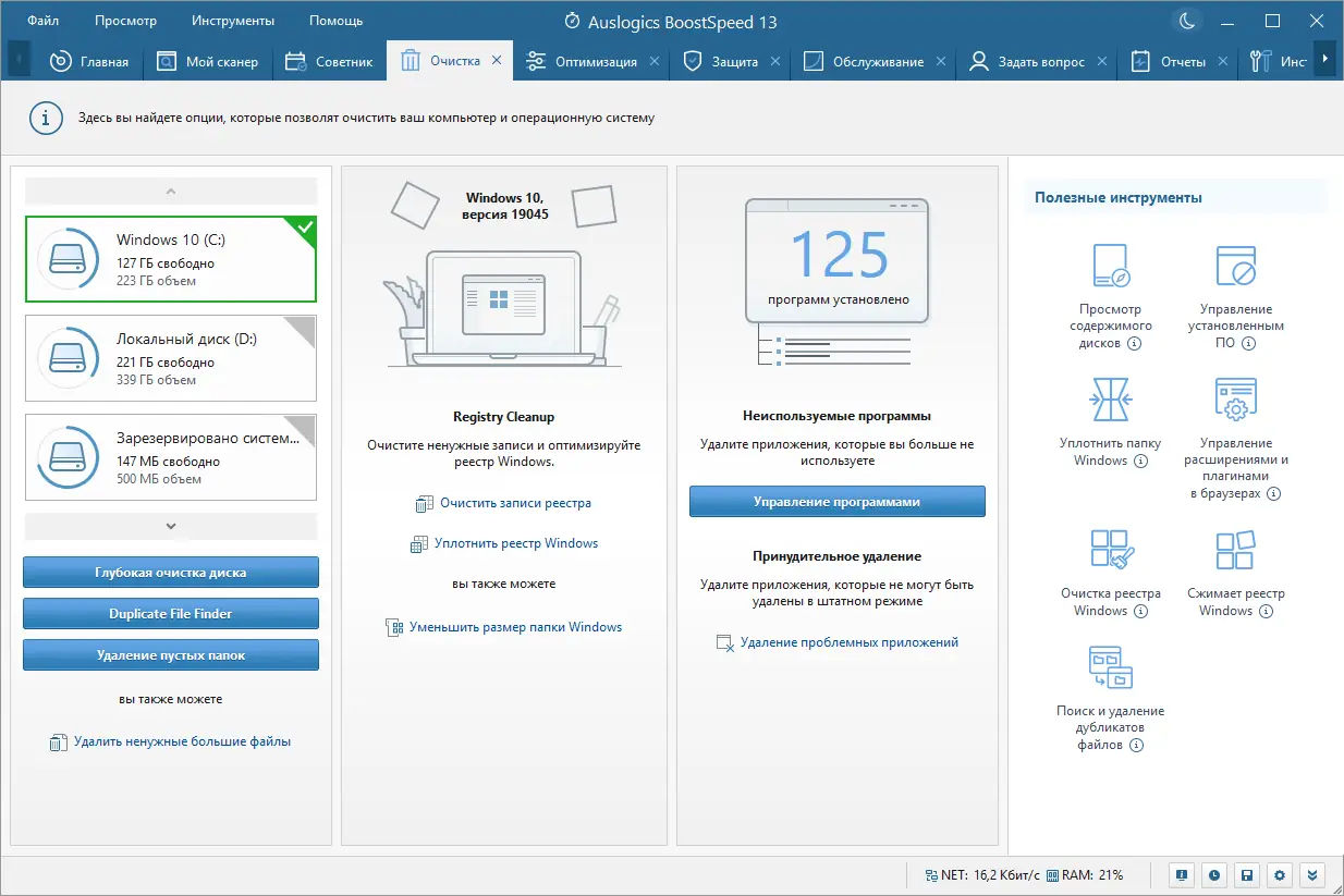 Auslogics BoostSpeed представляет собой многофункциональный твикер, предназначенный для комплексной оптимизации производительности компьютера под управлением Windows. Программа эффективно устраняет замедления системы, вызванные накоплением временных файлов, ошибками в реестре, фрагментацией данных и избыточной нагрузкой на автозагрузку. С её помощью можно не только ускорить работу ОС, но и освободить значительное количество дискового пространства, а также повысить стабильность и безопасность системы.
