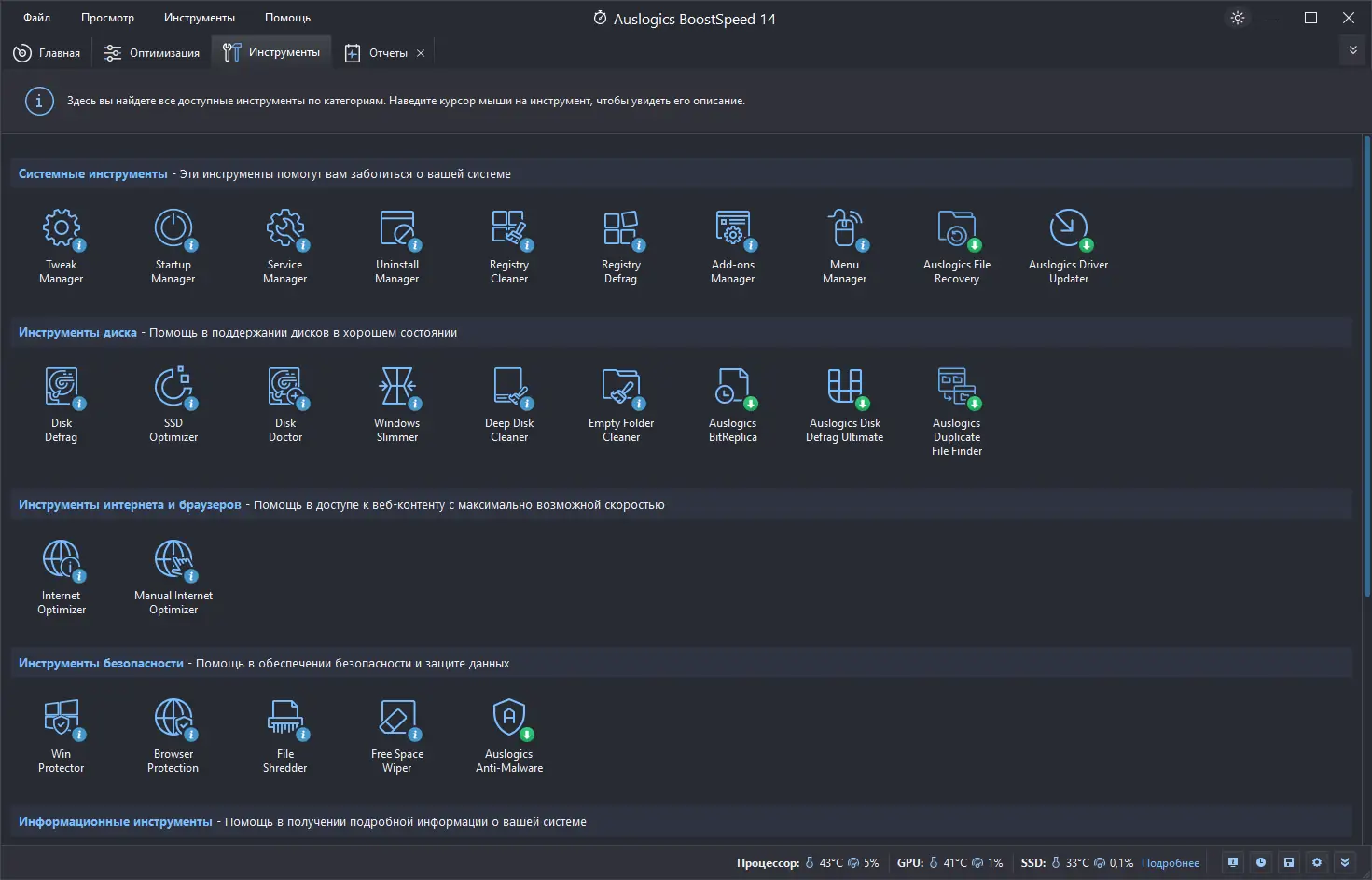 - Широкий набор инструментов для очистки, дефрагментации и настройки Windows.