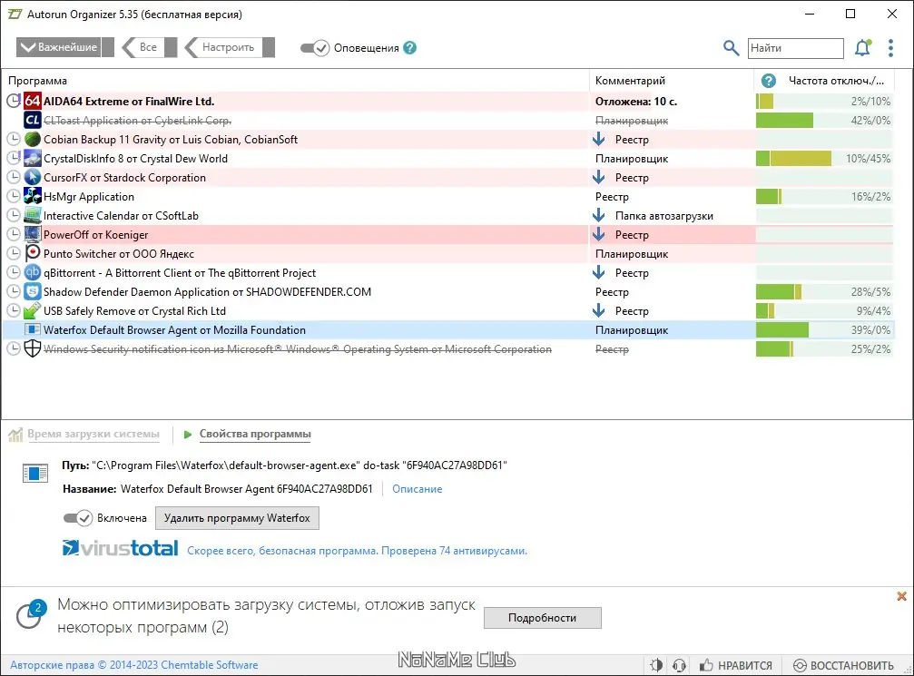 Autorun Organizer — это удобный инструмент для управления автозагрузкой в операционной системе Windows, позволяющий ускорить запуск компьютера и контролировать программы, стартующие при включении. Приложение отображает все элементы автозапуска, сортирует их по дате добавления и предоставляет средства для анализа, отключения или отложенного запуска. С его помощью можно легко оптимизировать производительность системы и устранить нежелательные или потенциально опасные процессы.