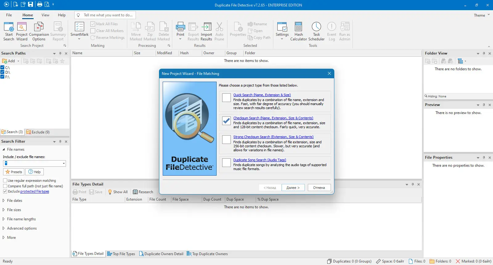 Duplicate File Detective — это мощное программное обеспечение для поиска и удаления дублирующихся файлов на жёстких дисках, съёмных носителях и сетевых папках. Программа анализирует содержимое файлов, используя хеши и побайтовое сравнение, чтобы точно определить дубликаты. Она помогает освободить дисковое пространство, ускорить резервное копирование и упростить управление данными.