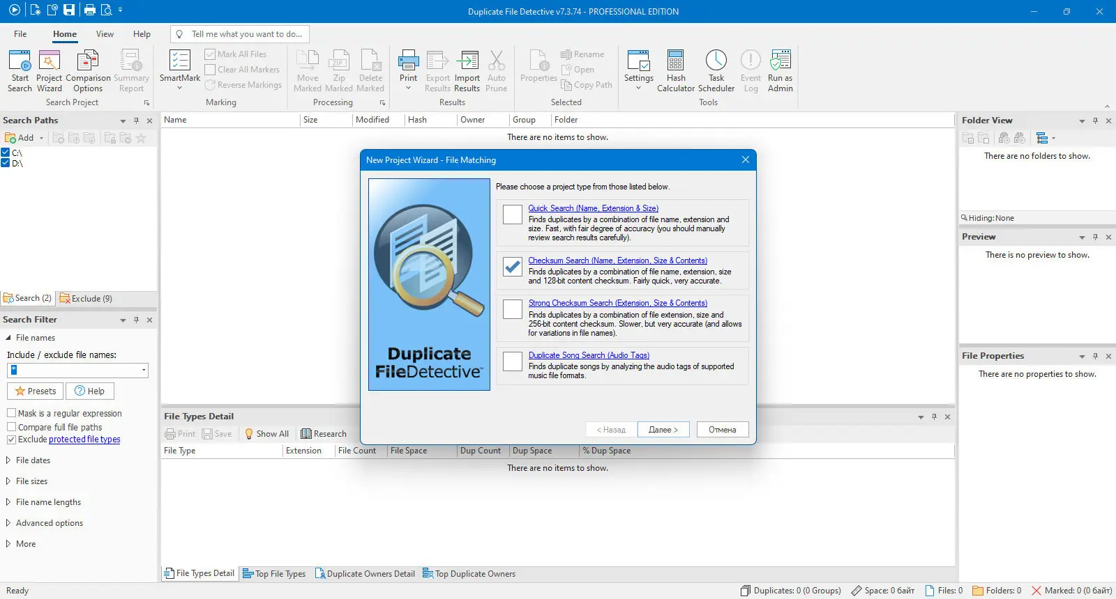 Для начала работы необходимо создать новый проект и указать пути для сканирования — это могут быть отдельные папки, весь диск или сетевые ресурсы. Далее задаются параметры фильтрации: маски имён, диапазон размеров, типы файлов и другие критерии. Программа запускает анализ, используя многопоточный алгоритм и кеширование хэшей для ускорения процесса.