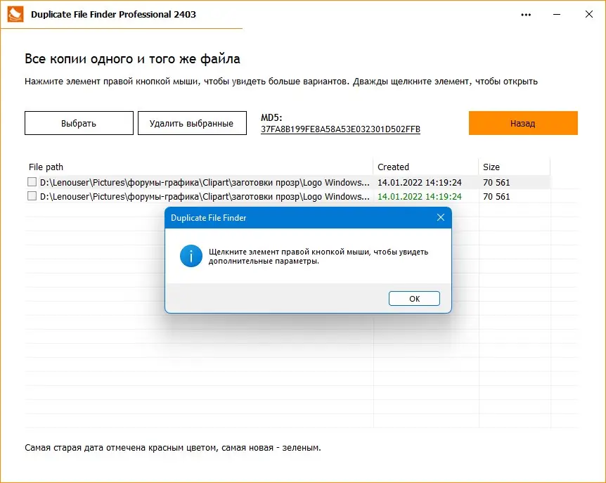 - Сравнение файлов по хэшу MD5 для максимальной точности