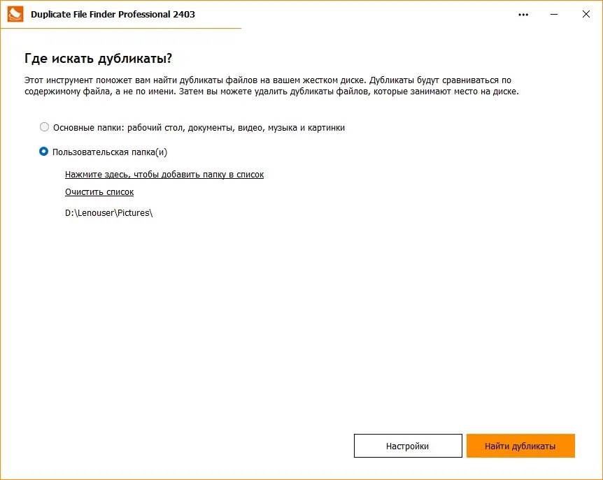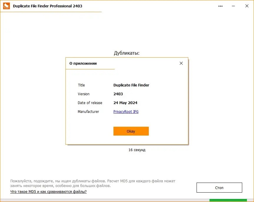 Duplicate File Finder — это утилита для поиска и удаления дублирующихся файлов на жёстком диске. Программа анализирует выбранные папки с помощью алгоритма хэширования MD5, обеспечивая точное сравнение по содержимому. Работа занимает считанные секунды, а интерфейс позволяет легко управлять найденными копиями.