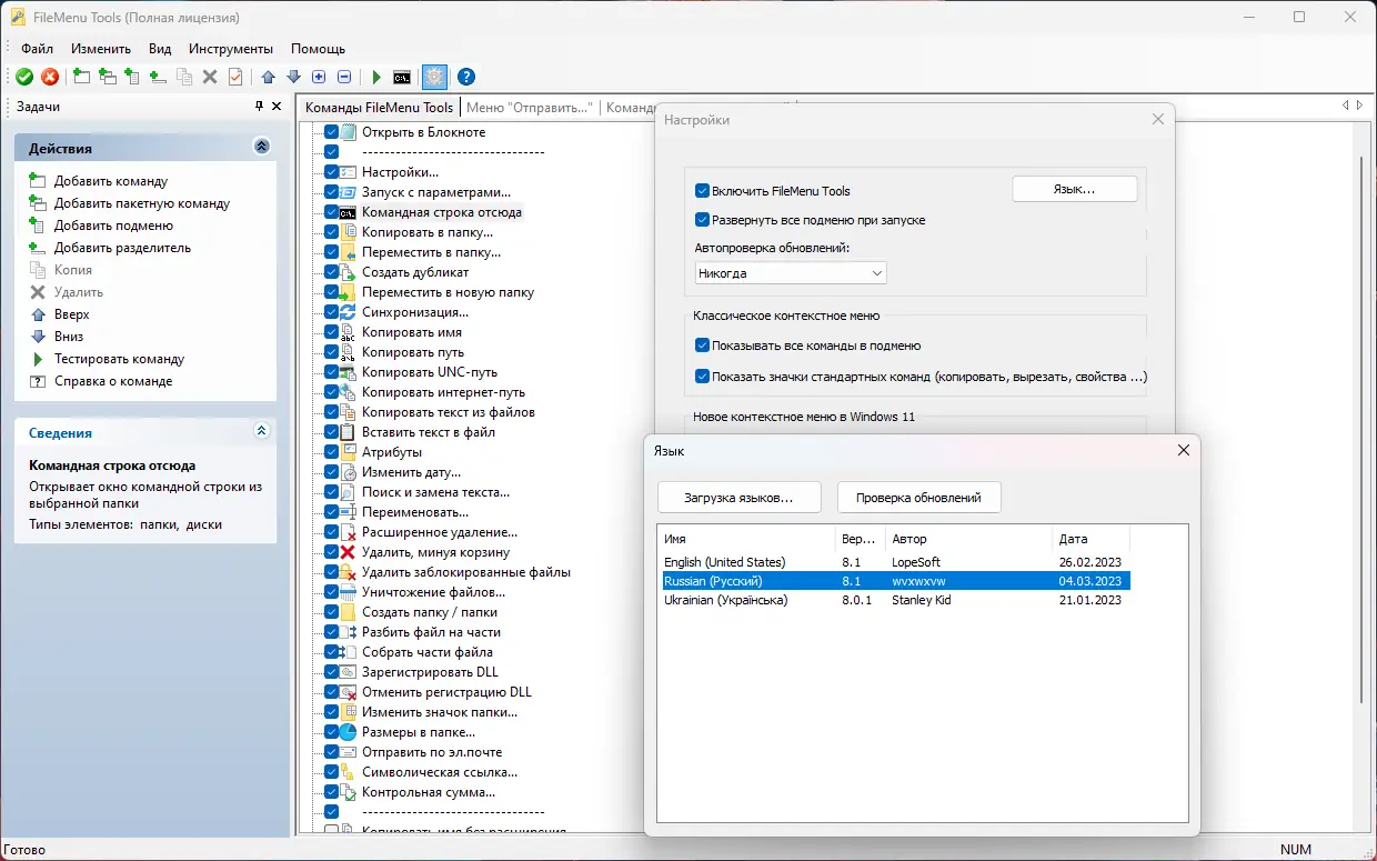 FileMenu Tools предоставляет пользователям широкие возможности по настройке интерфейса проводника Windows. Программа интегрируется в контекстное меню и позволяет добавлять команды для запуска приложений, выполнения встроенных утилит или выполнения пользовательских скриптов. Каждый пункт можно организовать в группы, создавать подменю и задавать порядок отображения, что делает навигацию интуитивно понятной и логичной. Это особенно полезно для тех, кто работает с большим количеством файлов и стремится минимизировать количество действий для выполнения рутинных операций.