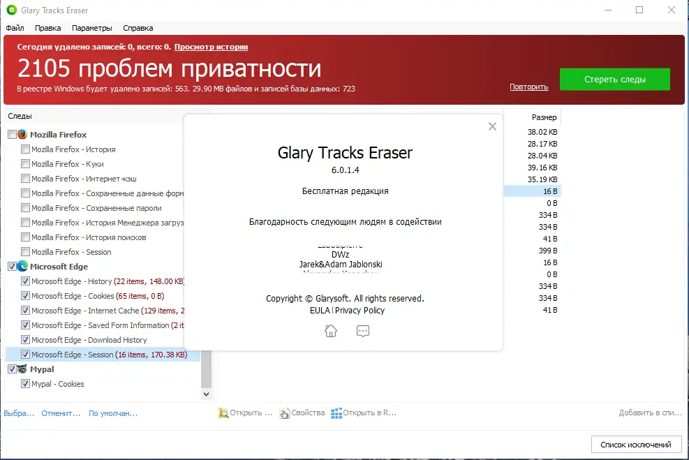 - Поддержка большого числа веб-браузеров и возможность индивидуальной настройки очистки.