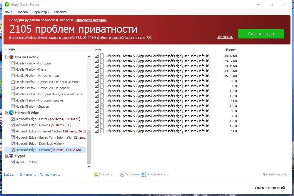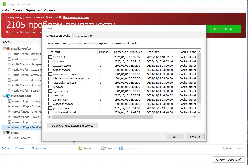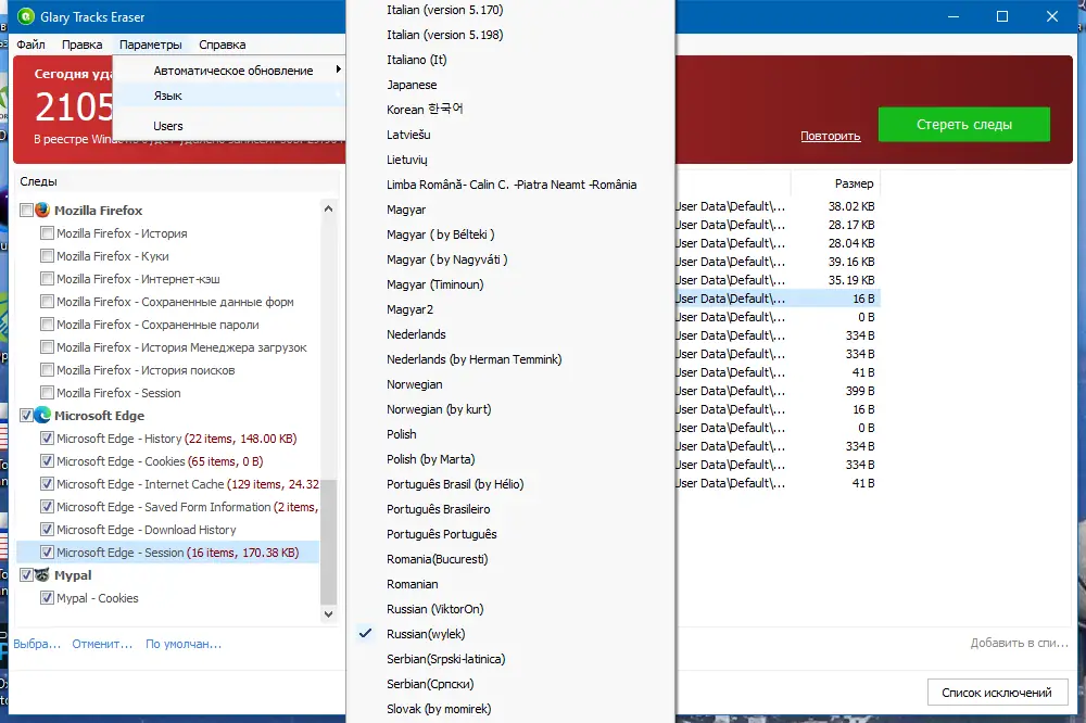 - Осуществляется очистка интернет-следов: история посещений, кеш, куки, сохранённые формы и пароли в различных браузерах.