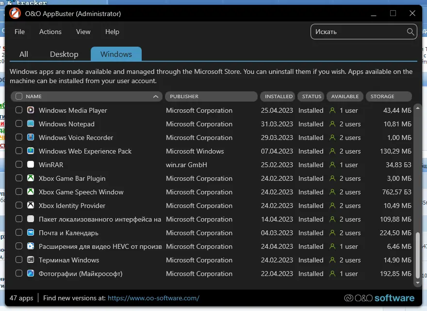 Программа O&O AppBuster предназначена для управления приложениями, которые автоматически устанавливаются вместе с обновлениями Windows. Многие из этих приложений редко используются, но занимают место на диске и могут фоново собирать данные. С помощью O&O AppBuster можно быстро деинсталлировать нежелательные компоненты, включая те, которые не отображаются в стандартном списке установленных программ. Интерфейс утилиты интуитивно понятен и не требует глубоких технических знаний.