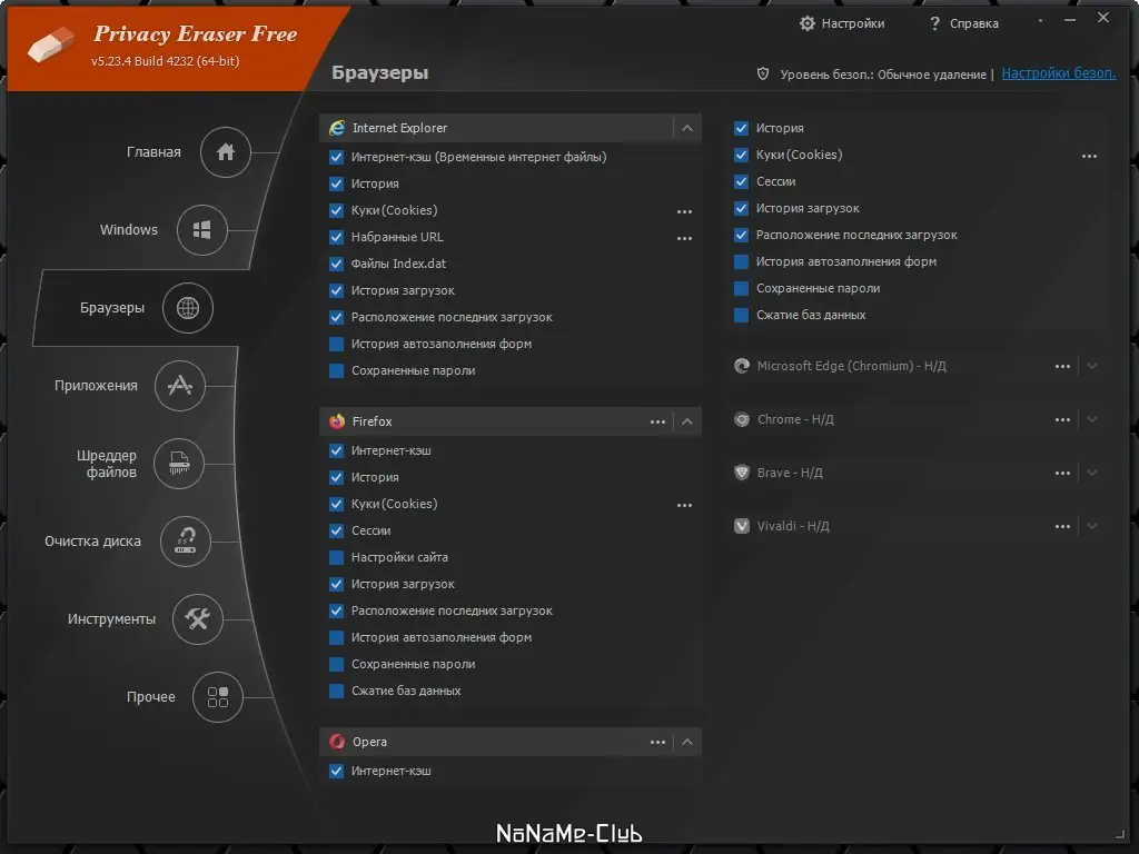 Privacy Eraser — это мощное приложение для комплексной очистки системы от цифровых следов активности пользователя. Программа удаляет историю браузеров, временные файлы, куки, данные автозаполнения, записи о последних документах и другие фрагменты информации, которые могут быть использованы для отслеживания поведения на компьютере. Решение подходит для тех, кто заботится о приватности и безопасности в цифровой среде, обеспечивая быстрый и надежный способ защиты личных данных.