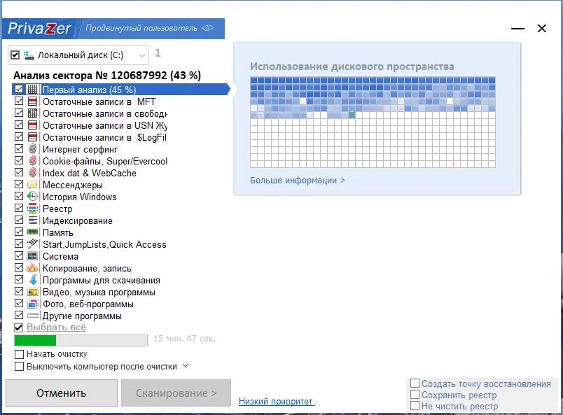 PrivaZer предлагает широкий функционал, ориентированный на защиту данных и оптимизацию системы. Одним из главных преимуществ является поддержка smart-очистки, которая умно распознает тип носителя и адаптирует методы перезаписи под SSD или HDD. Программа также включает более 100 различных проверок и процедур очистки, охватывая редко затрагиваемые области, такие как MFT, FAT и jumplists. Однако из-за обширного набора функций новичкам может потребоваться время для освоения интерфейса и настройки профилей очистки.