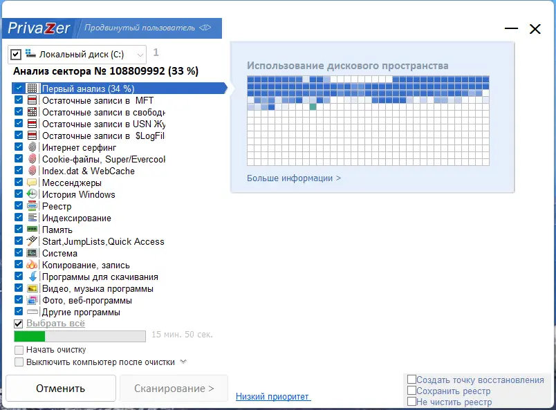 PrivaZer предназначена для комплексной очистки компьютера от цифровых следов, оставленных в ходе повседневной работы. Утилита анализирует не только очевидные места хранения данных, такие как временные папки и история браузеров, но и сканирует сложные структуры файловой системы, включая MFT, FAT, pagefile.sys и hiberfil.sys. Программа способна обнаружить остатки удалённых файлов, следы подключённых USB-устройств, кэшированные изображения и другие фрагменты информации, которые стандартные средства очистки пропускают.