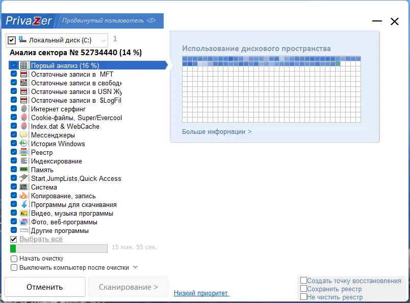 PrivaZer сочетает в себе функции очистки, анализа и защиты, обеспечивая многоуровневый подход к безопасности данных.