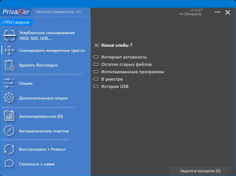 PrivaZer — это мощная утилита для глубокой очистки системы от конфиденциальных данных и следов активности. Программа тщательно сканирует жесткий диск, реестр, временные файлы и скрытые области, чтобы обнаружить остатки удалённой информации. Она обеспечивает надежную защиту приватности, предотвращая восстановление личных данных.
