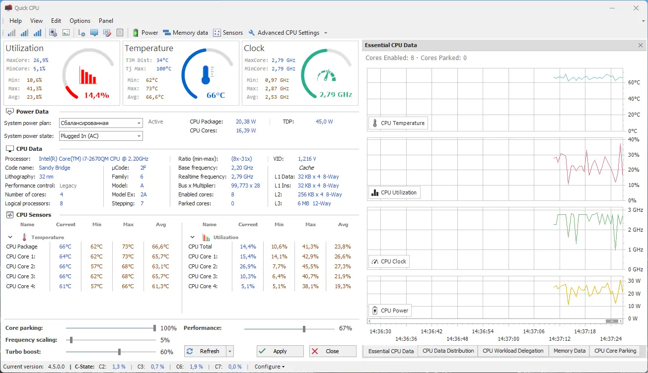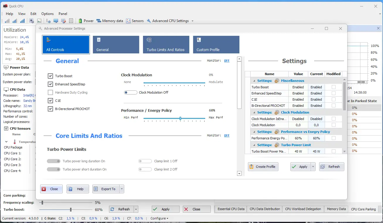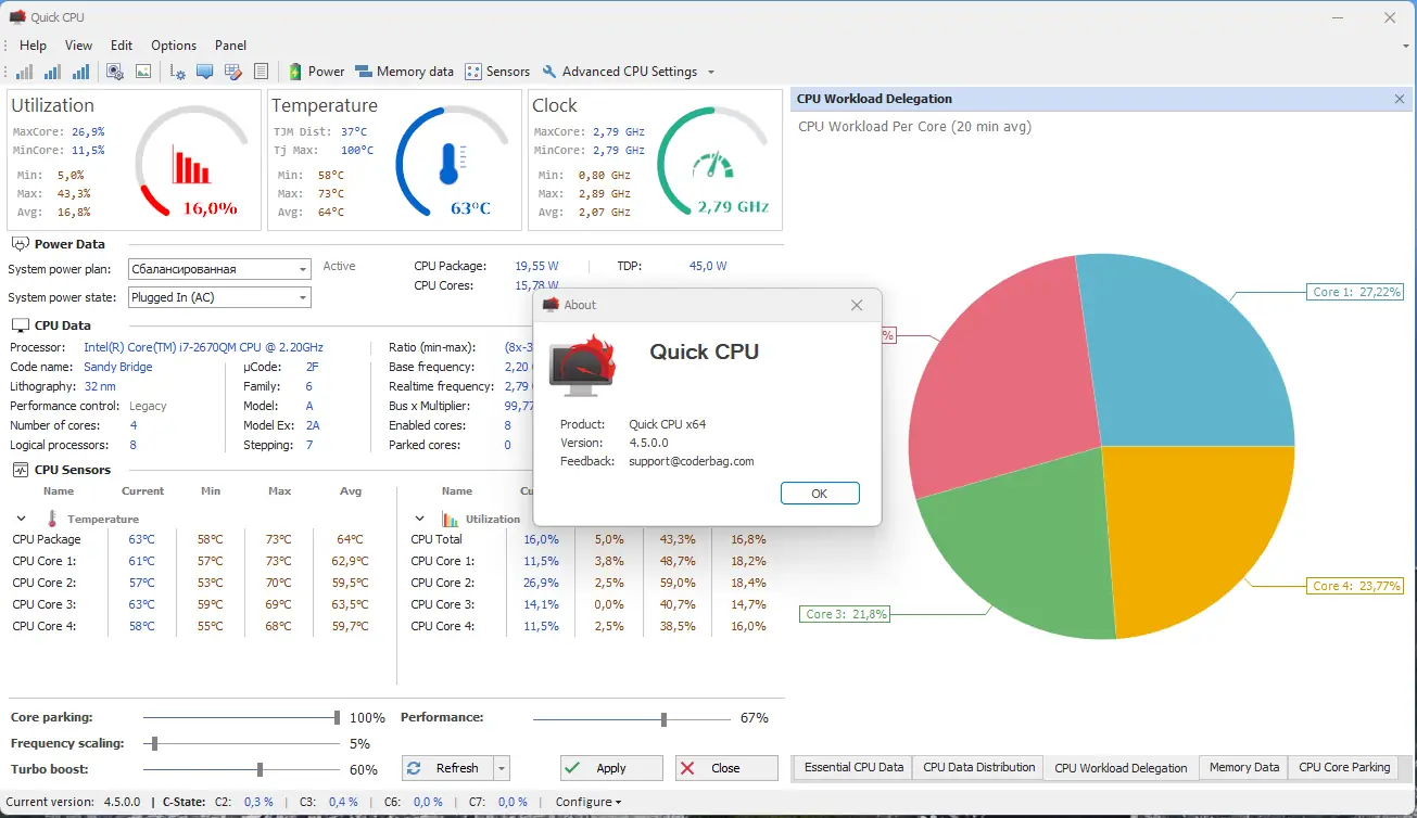 Quick CPU разработана для тонкой настройки процессора на уровне операционной системы, что позволяет эффективно управлять балансом между энергопотреблением и производительностью. Программное обеспечение ориентировано на продвинутых пользователей, которым важно контролировать такие параметры, как загрузка ядер, режимы энергосбережения и температурные показатели. Интерфейс приложения отображает детализированные графики активности каждого ядра, а также состояние их парковки и текущую тактовую частоту.