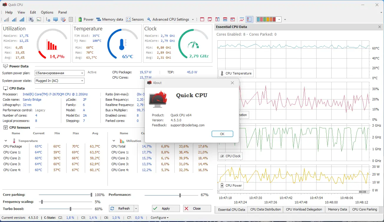 Quick CPU — это утилита для детальной настройки параметров центрального процессора, включая управление энергопотреблением, частотой, состоянием ядер и напряжением. Программа предназначена для продвинутых пользователей, которым необходим контроль над производительностью системы без перезагрузки. Она поддерживает современные технологии Intel и позволяет вносить изменения в режиме реального времени.
