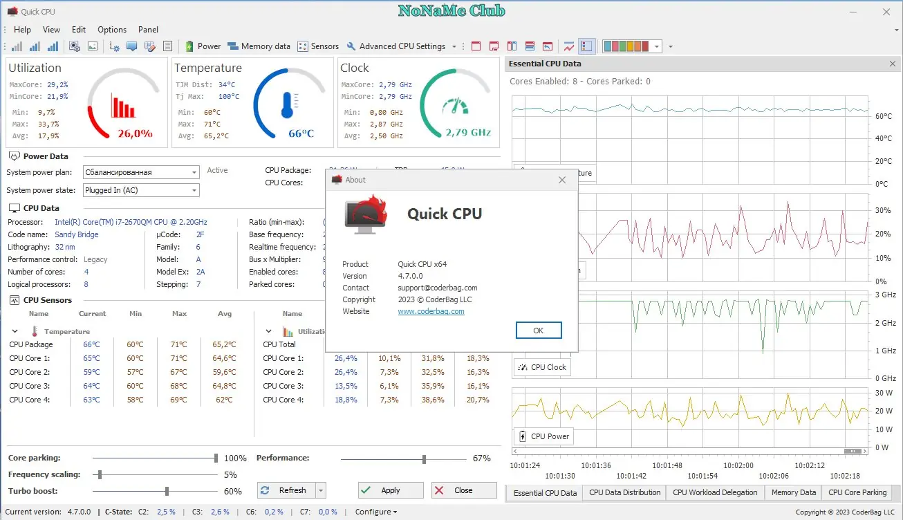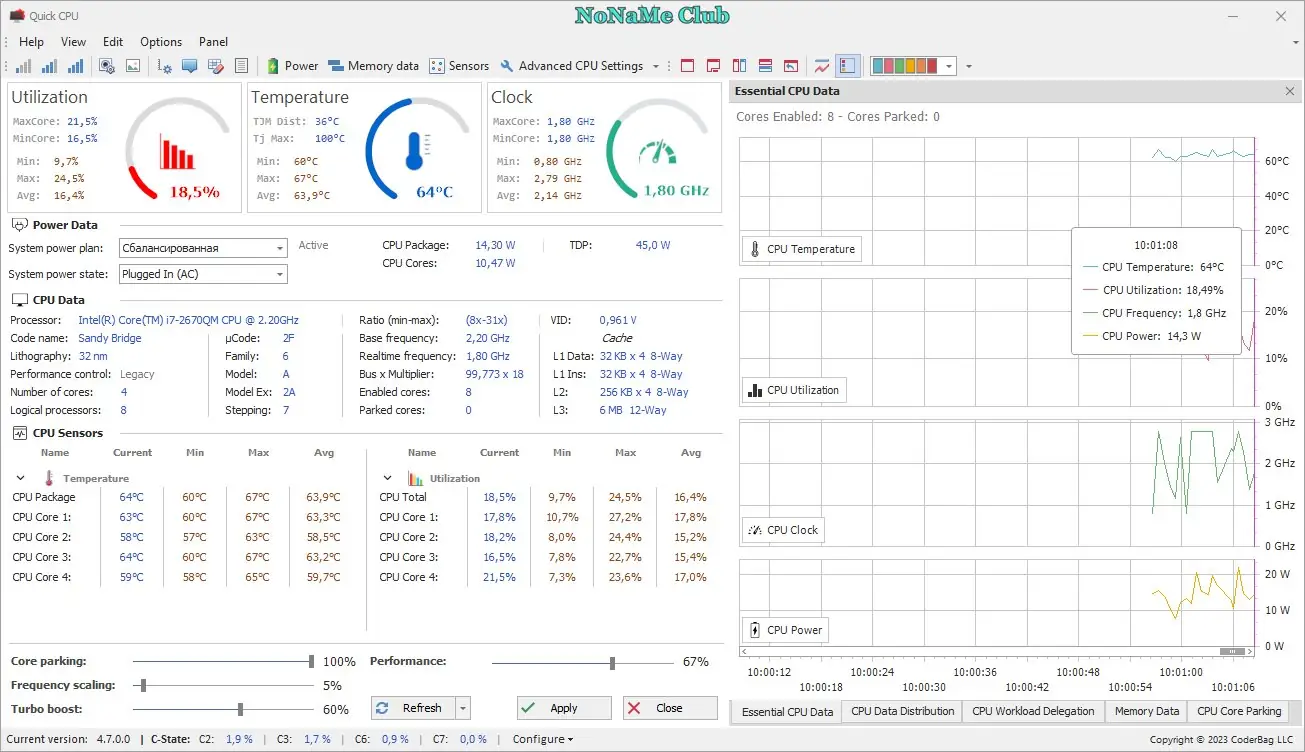 Quick CPU — это утилита для тонкой настройки параметров центрального процессора, включая управление парковкой ядер, частотами, энергопотреблением и тепловым режимом. Программа предоставляет доступ к продвинутым функциям, таким как контроль Turbo Boost, C-States, Speed Shift и FIVR, позволяя оптимизировать производительность и энергоэффективность системы. Поддержка мониторинга в реальном времени делает её незаменимой для продвинутых пользователей и энтузиастов разгона.
