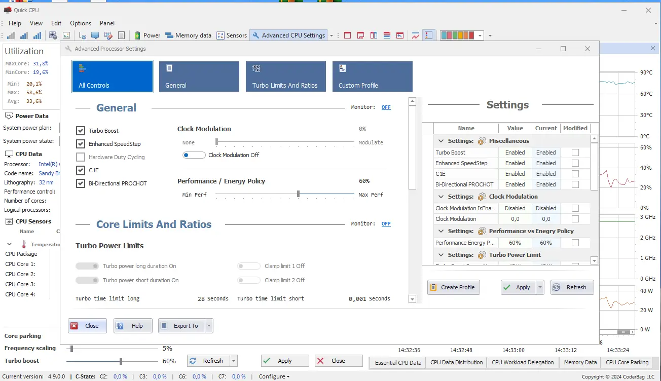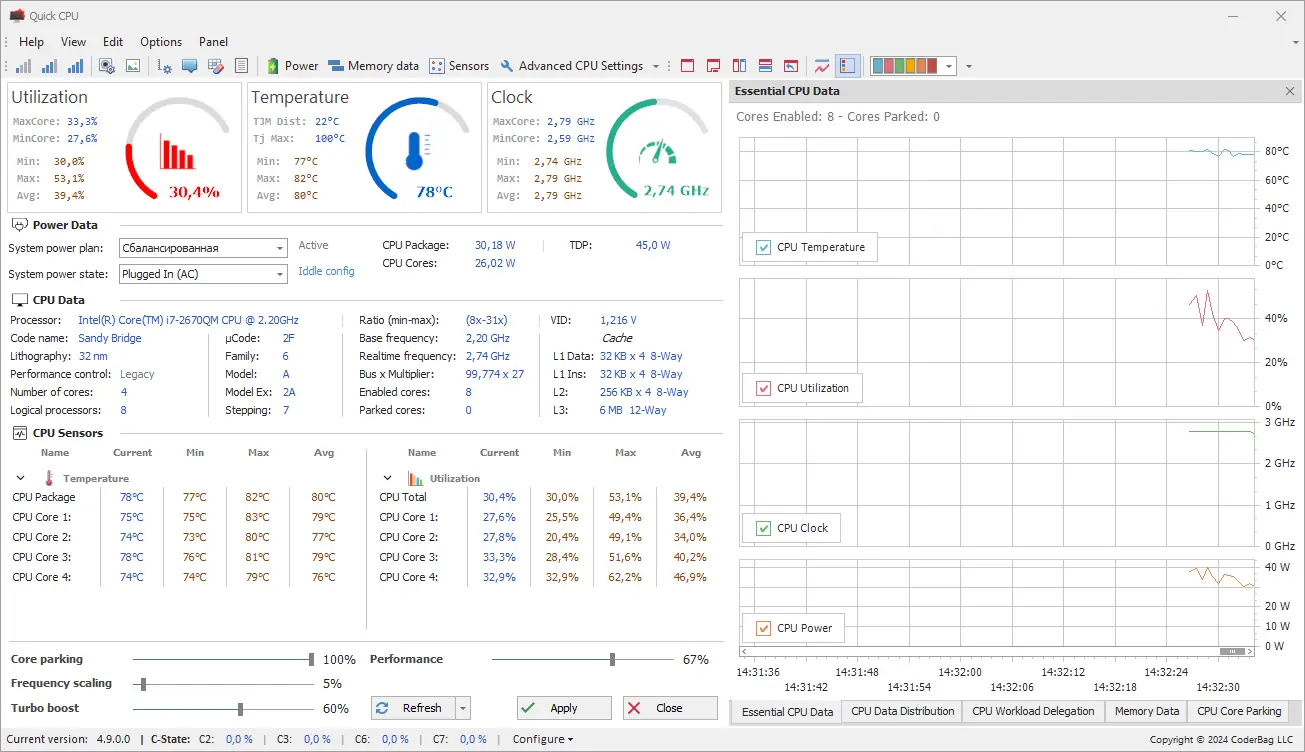 Quick CPU — это утилита для точной настройки параметров центрального процессора, включая управление парковкой ядер, частотами, напряжением и режимами энергопотребления. Программа предоставляет расширенный контроль над производительностью CPU в реальном времени, позволяя тонко настраивать систему под конкретные задачи. Поддержка современных технологий Intel и AMD делает её полезным инструментом для опытных пользователей.